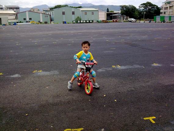 在我的威脅下,小寶乖乖的照著指令學,頂著大太陽,用雙腳先推著車走練平衡感