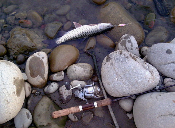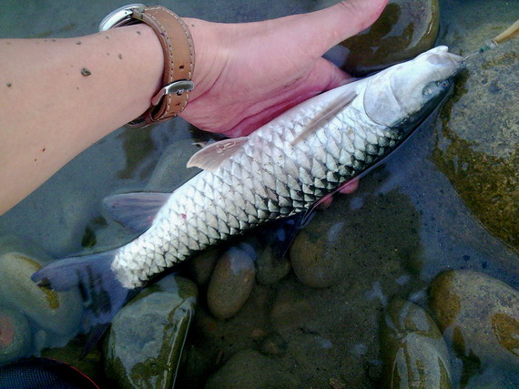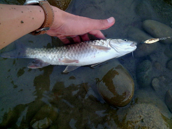隨後往急流點走,拋了幾竿來了這隻比較大的傢伙,起魚後一看....瞎捲...啊不就是蝦捲了...